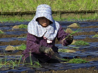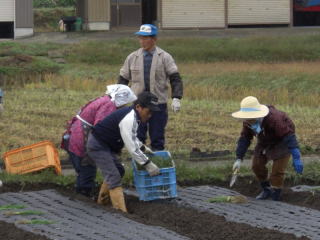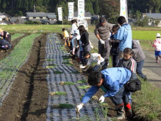 ↑ 大勢の皆さんが1本づつ手で植える(大変) |